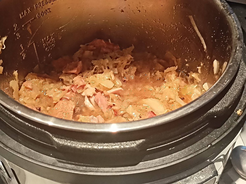 Rozpustím vepřové sádlo. Mírně osmažím cibuli nakrájenou na kolečka, přidám kostky masa, slaniny a klobásu nakrájenou na špalíky nebo kolečka. Míchám a vše společně opeču. Přisypu bílé zelí nakrájené na proužky, scezené a překrájené kyselé zelí, sušené houby (nenamočené), sůl a koření. Podliji třemi decilitry vody. Promíchám. Zavřu multifunkční hrnec. Nastavím vysokou teplotu a tlak po dobu 45 minut.