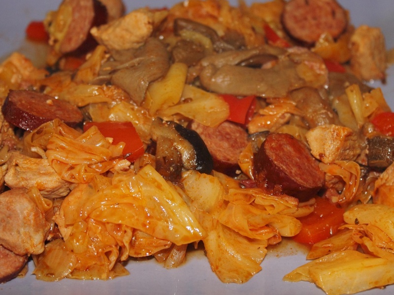 …sádlo rozpustím v litinovém kastrolu. Postupně osmažím cibuli, slaninu, maso a klobásu. Přisypu čerstvé zelí, osolím, zamíchám. Přidám pokrájené kyselé zelí a houby předem namočené ve vodě, a to i s vodou. Přiliji 400 ml vody, přidám všechno koření. Přiklopím poklicí a vložím do pečicí trouby. Teplotu nastavím na 180 °Celsia. Za občasného promíchání a dolévání vody peču/dusím asi tři hodiny.