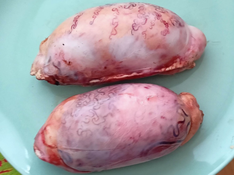 Zmrazený materiál necháme volně rozmrznout. Vyjmeme z balíčku. Vidíme, že každý kus je potažen celistvou pevnou organickou vrstvou. To je to, co je v kuchařských předpisech nazýváno „blánou“, ačkoliv se o blánu v pravém slova smyslu nejedná. Nám, laikům, se to jeví spíš jako nějaká „kůže“, tak je to silné. A tento kožovitý povrch je třeba odstranit. Připravíme si malý ostrý nůž nebo skalpel, citlivější povahy nebo osoby s dlouhými nehty také chirurgické rukavice.