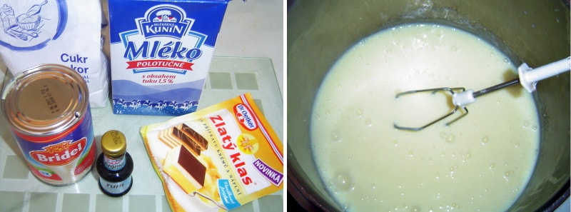 Na pudinkový krém rozvařím pudinkový / krémový prášek (osvědčil se mi nejlépe Zlatý klas) v 500 ml mléka a po svaření přidám asi 100 ml mírně ředěného kondenzovaného mléka nebo smetany.
