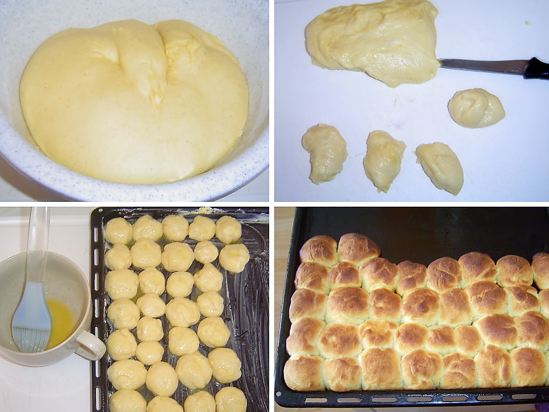 Vykynuté těsto rozdělím na pokud možno stejné dílky. V ruce zaoblím a kladu na vymazaný plech. Na těsto z 250 g mouky stačí vymazat jen polovinu plechu. Buchtičky i svrchu potřu máslem a dám do trouby vyhřáté na 250 °Celsia, přičemž po vložení plechu teplotu stáhnu na 180 °Celsia. Pečení trvá asi 15 minut, ale po deseti minutách je zkontroluji pohledem, v jakém stavu upečenosti se buchtičky nacházejí.
