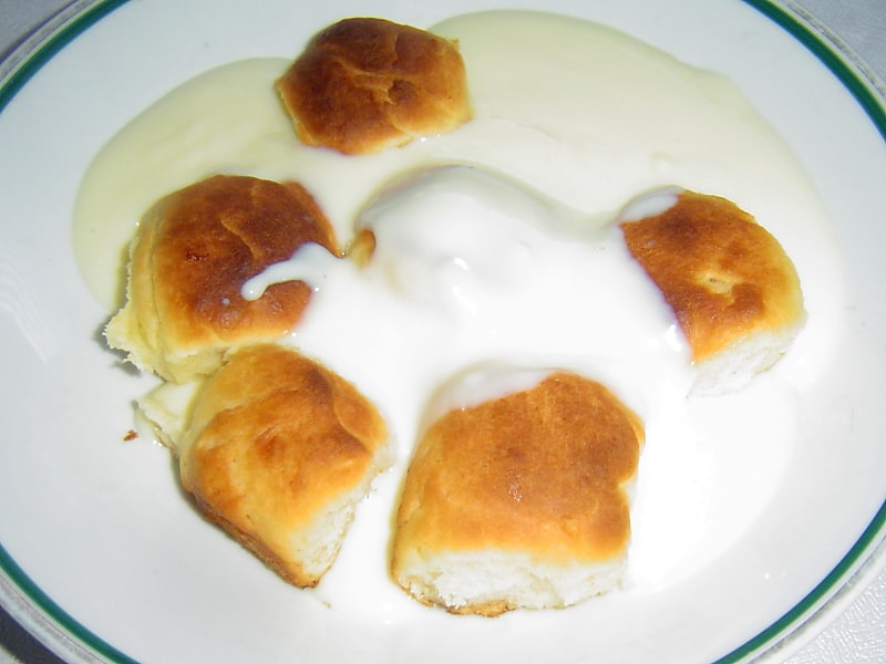 Tento krém je vhodný, když jsou dukátové buchtičky připravovány jako hlavní chod k obědu. Krém je levný, smetanu nebo kondenzované mléko ani nemusíme přidávat, můžeme jej uvařit hodně, aby si děti mohly přidávat krém podle libosti.