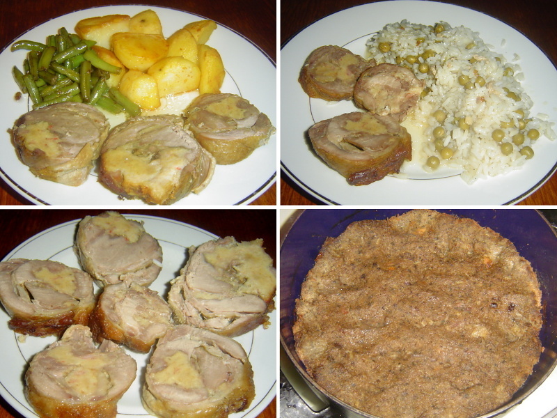 Naplněný plát jsem smotala do rolády, ovázala nití. Vložila do pekáče, pokladla kousky másla, podlila vodou a dala péct na 180 stupňů. Po hodině pečení jsem roládu obrátila a pekla ještě asi 45 minut. Během pečení jsem ji několikrát polila výpekem a doplnila vodu.