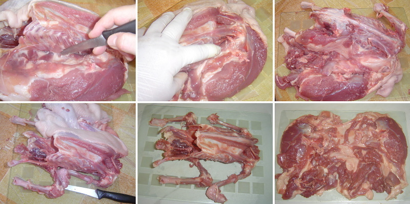 Krátkými energickými tahy vedenými po skeletu odřezáváme maso. Nejdřív prsní svalovinu. Pak obřežeme kloub křídla ze všech stran a kůži z kosti svlékneme bez rozříznutí (jde to snadno). Poté kolem dokola nařízneme kůži nad kloubem stehna, přeřežeme šlachy. Rozřízneme kůži stehna, jako by to byl vnitřní šev kalhot.