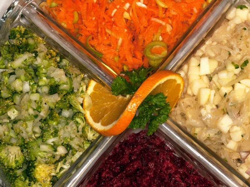 - Pokrájíme dvě lodyhy chřestu nebo jeden malý pórek, 6 zelených fazolí, čtvrt hlávky salátu, 2 lžíce petržele, 1/2 broskve nebo jablka (případně 1/2 avokáda) a postrouháme jednu karotku, přidáme 50 gramů tvarohu posypaného dvěma lžícemi ořechů. Nepřidáváme žádné koření (1 porce).