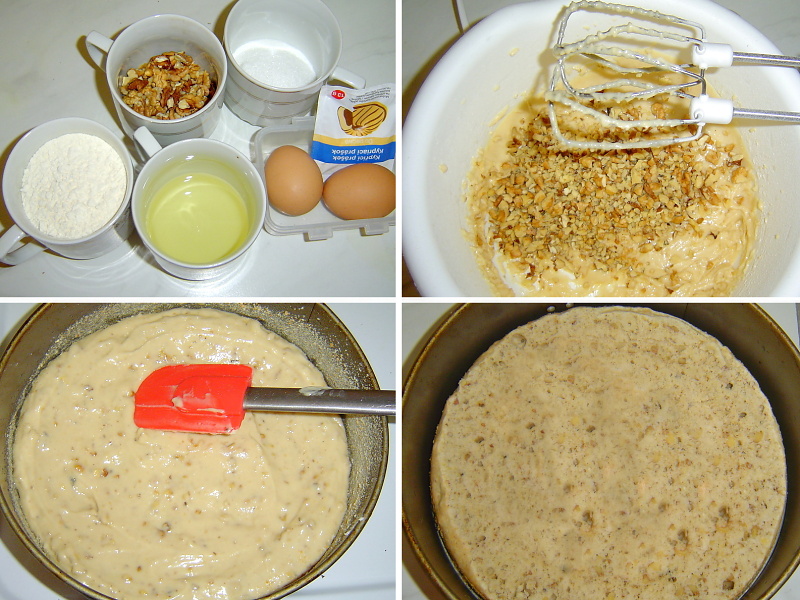 - Vejce šlehám s cukrem a olejem, přisypu mouku s práškem do pečiva a nakonec ořechy. Kdyby bylo těsto moc tuhé, přidám dvě lžíce mléka.
