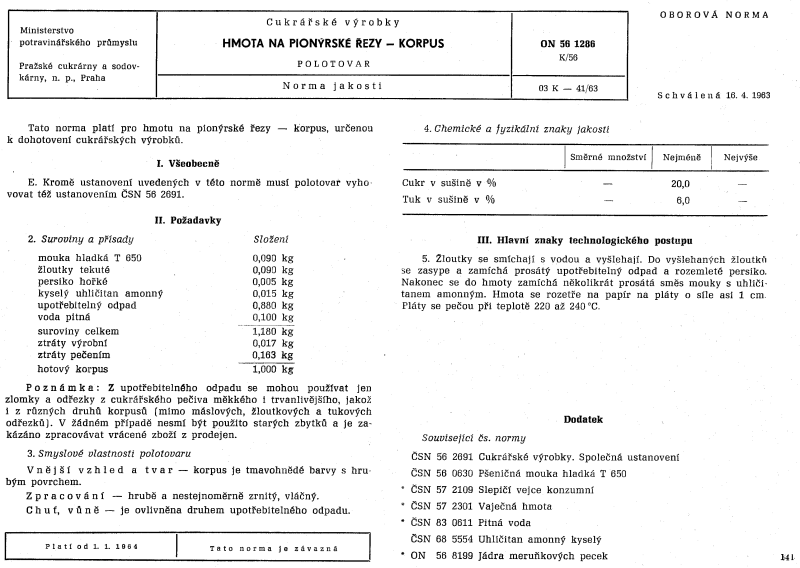 To bylo tak. Spíš ze zvyku než z nějaké potřeby jsem listovala souborem starých cukrářských oborových norem. Tentokrát mě zaujala receptura 03K – 41/63, a to „Hmota na pionýrské řezy – korpus“. No, páni! To je tedy gól! Ukažte mi, prosím, ženskou (s jistou délkou paměti), kterou by nezajímalo, z čeho asi se takové pionýrské řezy vyráběly. ;=) Jenomže můj objev nebyl pouze úsměvný. Zapadl navíc do připravené úrodné zeminy: