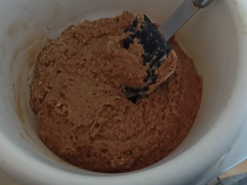 Rozsekanou drť jsem přesypala do pracovní mísy. Přisypala jsem 45 g hladké (špaldové) mouky a plnou polévkovou lžíci amonia. Suchou směs jsem důkladně promíchala. Odměřila jsem 50 ml vody a metlou v ni rozšlehala dva oddělené syrové žloutky. Emulzi jsem vlila do suché směsi a do prázdné odměrky nalila případnou další vodu. Ručně jsem rozmíchala. Tekutiny bylo málo, tak jsem po kapkách přilévala připravenou vodu.