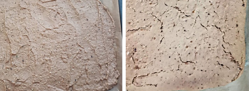Hmota se rozetře na papír na pláty o síle asi jeden centimetr. Pláty se pečou při teplotě 220 – 240 °Celsia.“