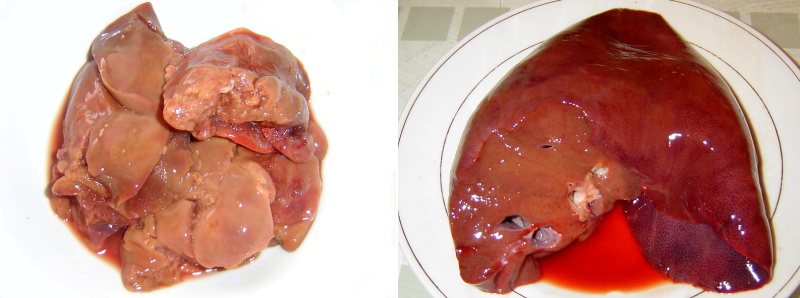1. V současné době jsou nejdostupnější játra drůbeží (na snímku vlevo). Jsou sice jemná, ale jiná než játra vepřová či hovězí, která na knedlíčky používaly babičky. Kde by naše babičky přišly k drůbežím játrům? I když musely kuře před přípravou oškubat a vyvrhnout, jatýrka z jednoho kuřete by byla na knedlíčky málo. To je raději uvařily a rozkrájely do polévky jako lahůdku.