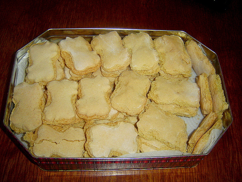 V tom pytlíku (od mouky), který nám každoročně dávala, bylo vánoční cukroví všeho druhu. Nejdřív jsme se sestrou vyjedly sněhové pusinky slepované kávovým krémem. Pak rohlíčky plněné máslovou nádivkou, malé laskonky, išelské dortíčky. Až zbyly jen placky podivných tvarů potažené citronovou polevou. Někdy bretonem zbarvenou na bledě modro. Ty nám tedy vůbec nechutnaly. „To jsou zázvorky,“ informovala naše máti. „Ty pekla taky paní Tužilová a pořád mi je dávala. Ach, zázvorky jsem tak neměla ráda.“ Kdo nakonec ty zázvorky z pytlíku snědl, to nevím. Asi táta. My vyrůstaly v přesvědčení, že zázvorky nejsou dobré, tak jsme je nejedly.